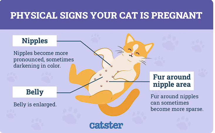 Nipple Alert: Around week 3, her nipples get bigger and pinker. We call this “pinking up” (cute name, right?). It’s like her body’s getting the milk bar ready for business, these signs can be confused with other issues like hair loss in cats or weight gain.
